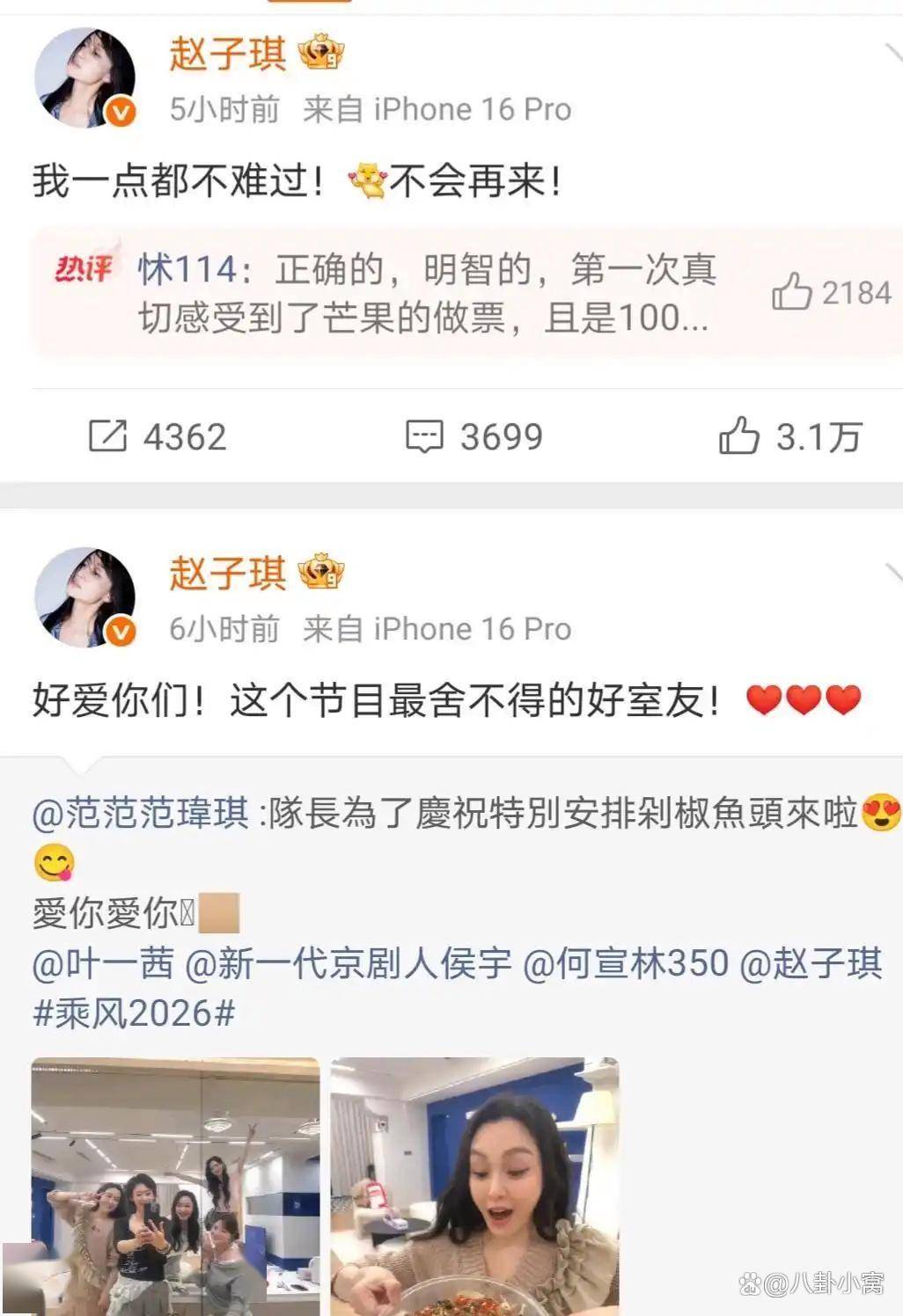 面对淘汰,赵子琪在凌晨5点发了一条只有10个字的微博:“我一点都不难过!不会再来!”没有撕逼,没有卖惨,甚至没有多余的解释。