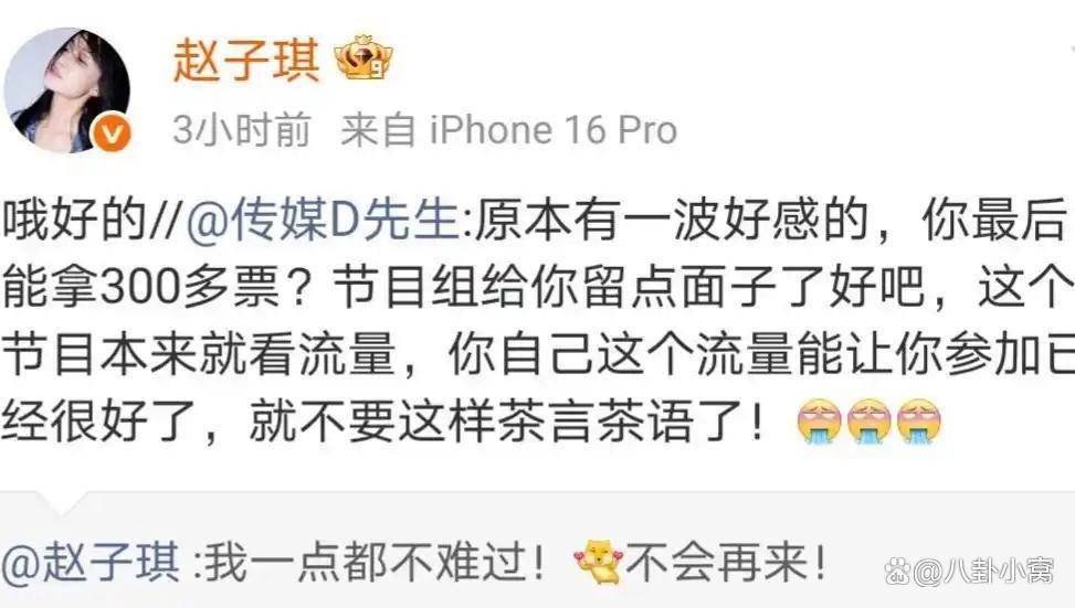 当有网友质疑她“最后能拿300多票?节目组给你留点面子了好吧,这个节目本来就看流量”,赵子琪只回了三个字:“哦好的”。这种懒得争辩的无奈,和看透一切的疲惫,比任何激烈的控诉都更让人心疼。