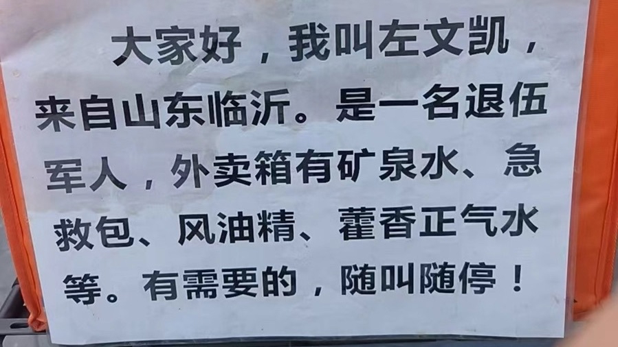 这不是左文凯第一次“见义勇为”。这位“95后”退伍军人、预备党员,早已是大家口中“专接救人加急件”的侠义骑士。2024年,他跑单时遇老旧居民楼失火,毫不犹豫拎起途中发现的灭火器冲上楼,成功救出被困老夫妇,还骑电瓶车为消防员引路、通报火情;2018年夏天,他纵身跳入苏州河救下跳河男子;今年六月末,街头发生交通事故,他第一时间用急救包为伤员包扎,待交警到场后默默离开……这些被他视作“举手之劳”的“小事”,早已成为刻在骨子里的责任与担当。