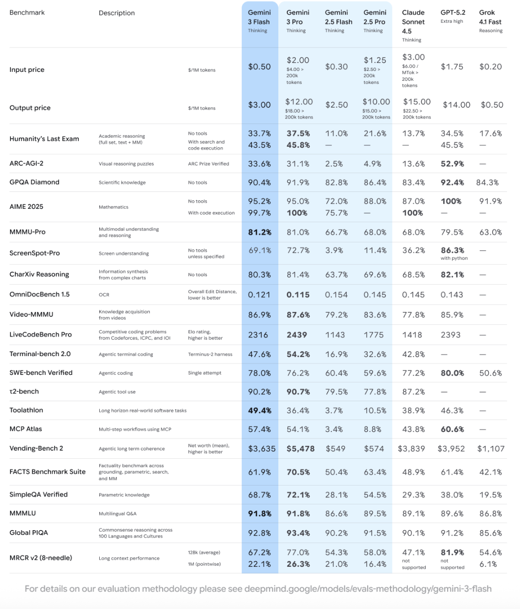Gemini 3 Flash保留了Gemini 3 在复杂推理、多模态、智能体和编程任务方面的突破性性能,同时结合了 Flash级别的延迟、效率和成本优势相结合。“这是迄今为止在智能体工作流程方面最出色的模型。”谷歌称。